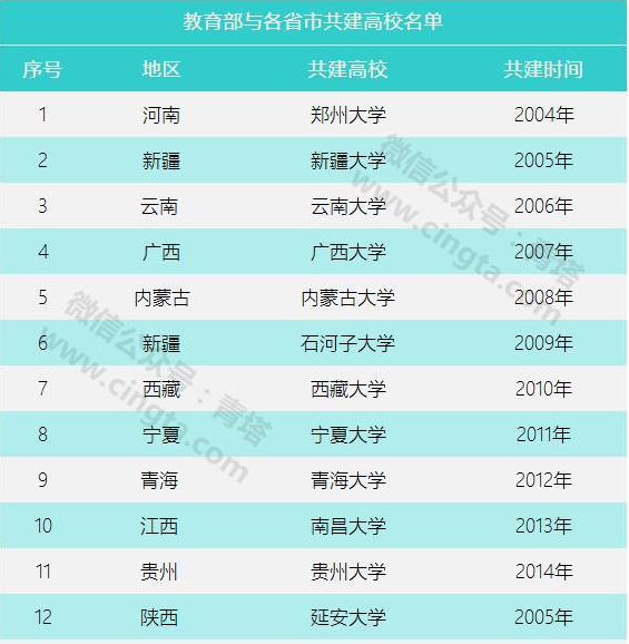 2004年,当时教育部经过各方面论证研究,决定与河南省共建郑州大学,这才有了我国第一所省部共建大学。此后,教育部开始与地方逐渐开展省部共建大学建设,不过教育部早期重点支持的还是中西部地区的高校,特别是没有教育部直属大学的省份得到了优先支持,包括新疆大学、云南大学和广西大学等都陆续获得了教育部的共建。
