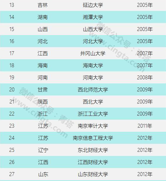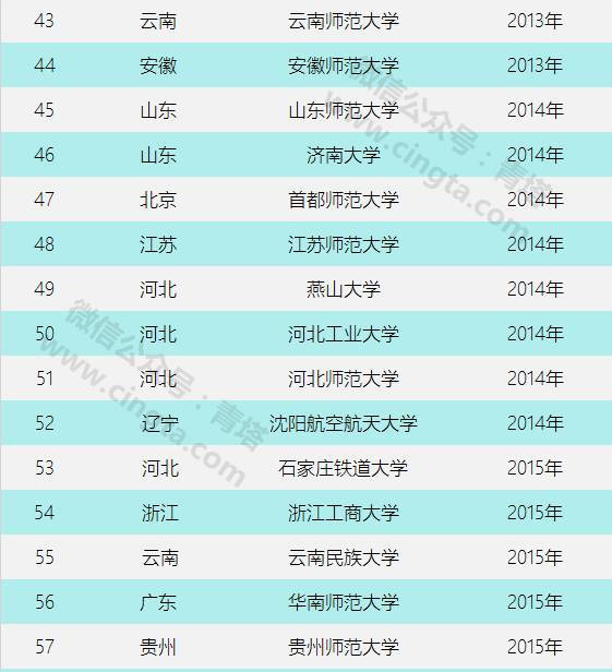 在省部共建大学的推行和建设取得良好效果的情况下,全国获得教育部共建的高校开始陆续增多。直至今日,全国已经有75所地方高校获得了教育部的共建,能够得到教育部共建的基本上都是各地区的地方高校佼佼者,不仅仅中西部的高校获得了教育部的共建,很多东部发达地区的省属强校也获得了教育部共建。而且,从2012年起,进入到教育部共建的高校数量开始显著增多,特别是最近两年来,越来越多的地方特色强校都获得了教育部的共建,其中的很多还获得了其他部委的联合共建,例如燕山大学、东北财经大学和浙江工商大学等都是教育部和其他部委一起和地方共建的,此外,教育部还与国家卫计委大批量的同时共建了10所地方医科强校。来看看这些年来,获得教育部共建的地方大学名单吧: