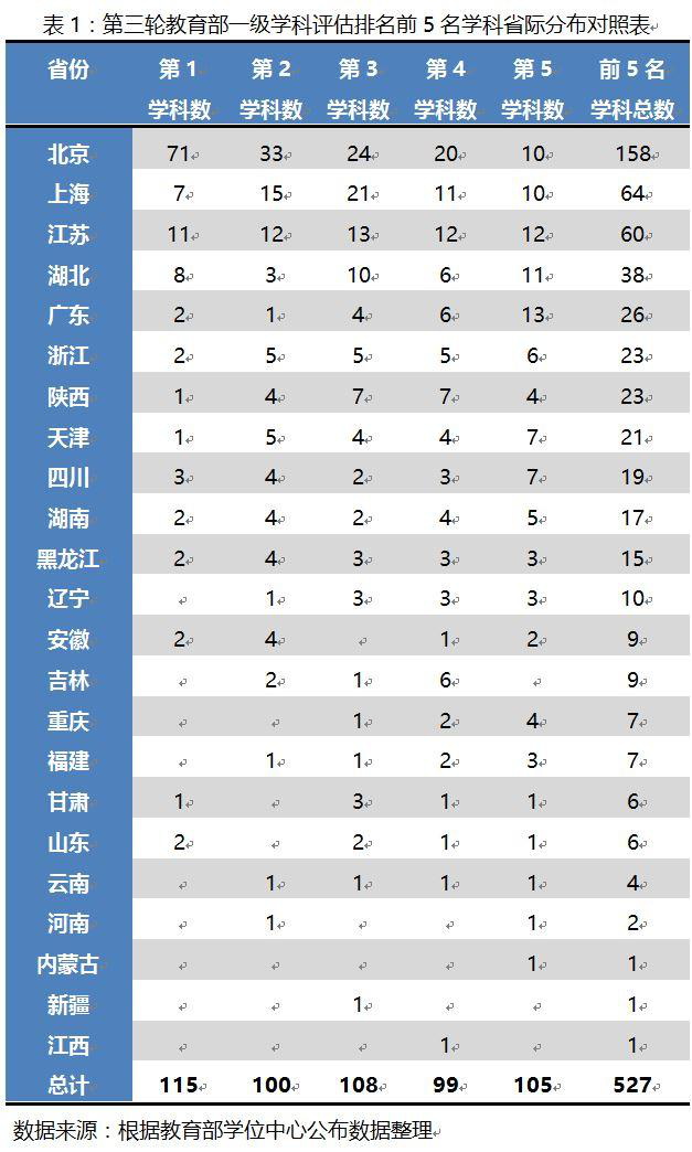 经过统计(详见表1),笔者惊讶地发现,第三轮学科评估共计4166个学科参评,其中排名前5名的学科数共计为527。北京市的科研院所拥有的优势学科共计158个,比例高达30%,排名第1的学科数占比更是高达62%,形成了一家独大的格局。与此同时,贵州、广西、宁夏、青海、西藏、山西、河北、海南八个省份的优势学科数竟然为零,其中就包含了贵州大学所在的贵州省。此外,还有内蒙古、新疆和江西三个省份的优势学科数只有1个,河南和云南的优势学科数也不足5个。这可以从一个侧面来印证国家对相关省份高等教育建设投入的不足。