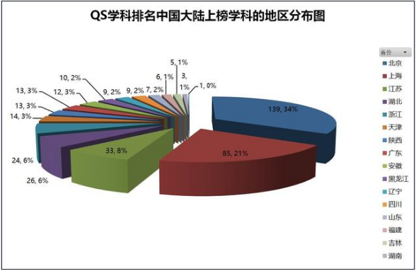 日前,QS发布了最新一版的世界大学学科排名,中国大陆共计60所大学共计409个学科上榜,其中有65个学科进入全球前50名。从国际排名数据来看,中国大陆高校已经出现了一批相当规模的优势学科进入世界一流的行列,同时也涌现了一定数量的学科进入世界一流前列。 从这些学科的省际分布来看,北京和上海两市的世界一流学科数量分别为139个和85个,占比分别达到34%和21%,两个直辖市合计占比达到55%。如果再加上江苏、湖北和浙江,五省市的世界一流学科数达到惊人的75%。