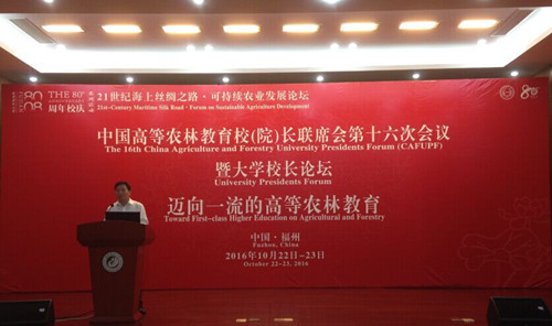 10月22日下午,在福建农林大学迎来建校八十周年华诞之际,中国高等农林教育校(院)长联席会第十六次会议暨大学校长论坛在福建农林大学金山校区召开。全国54所农林高校以及台湾大学、中兴大学、朝阳科技大学、东华大学等8所高校的校长和代表共计139人参加了会议。符少辉校长代表我校出席了会议,并在会上发表了题为《地方农业院校实施特色发展战略的探索与实践——以湖南农业大学为例》的主旨演讲。